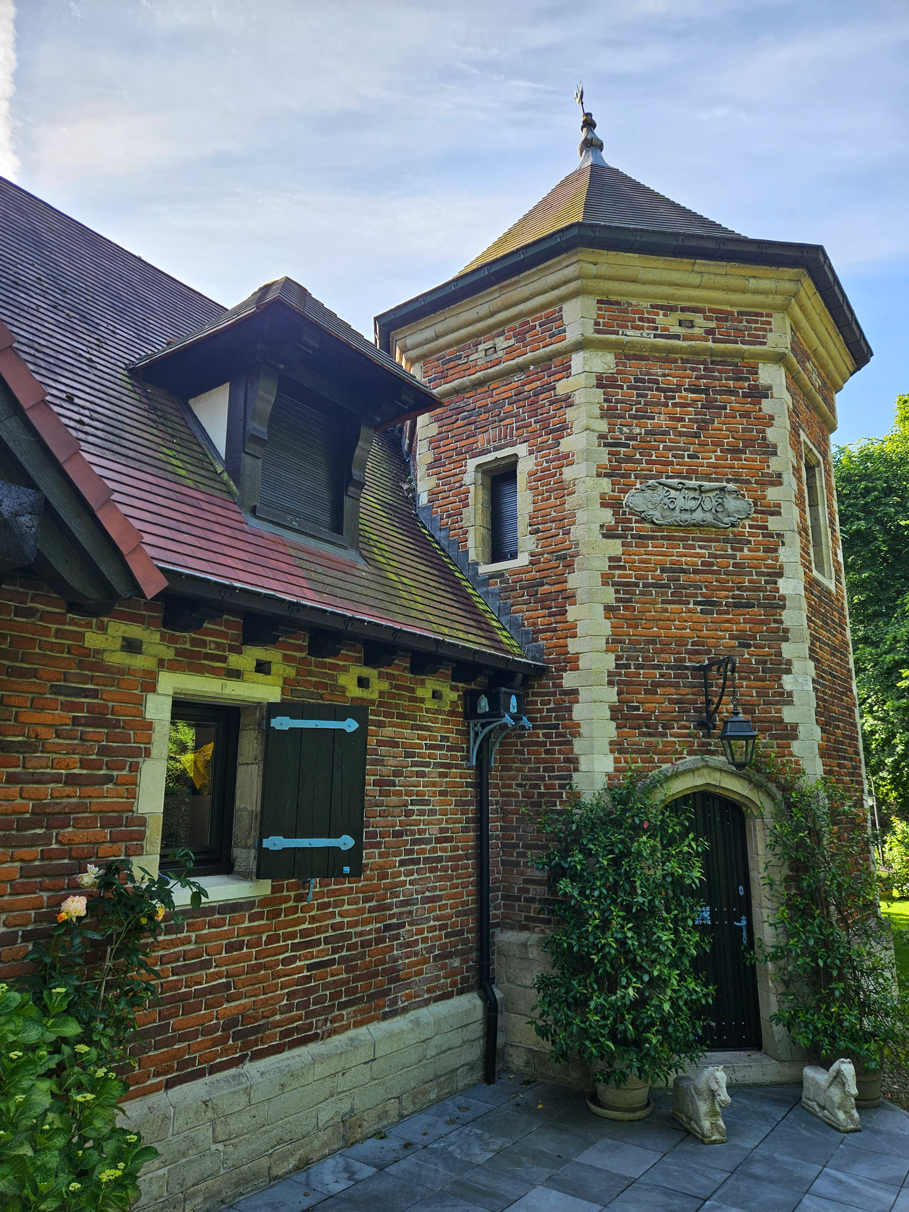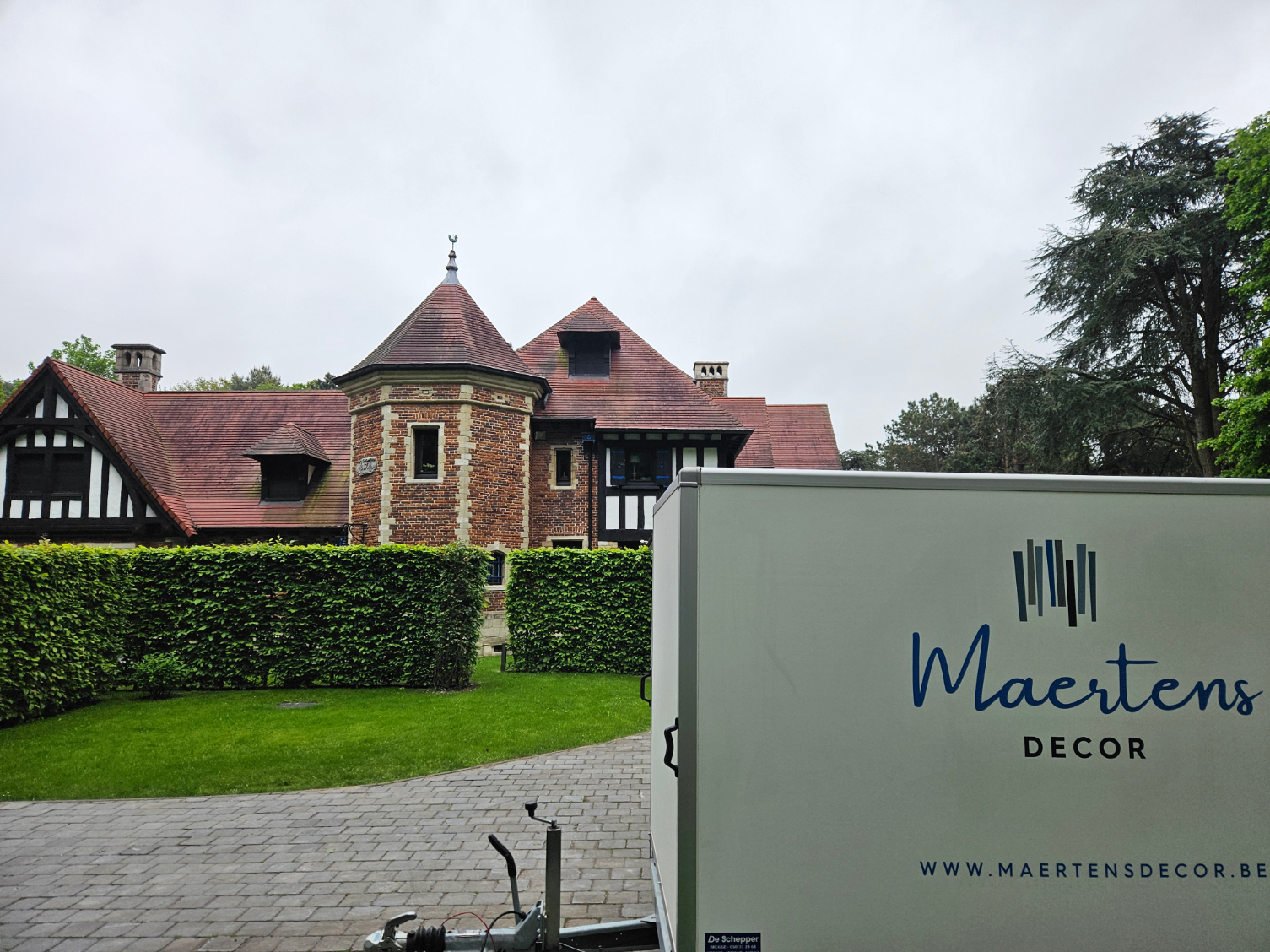 Na deze herstellingen werd het hout opnieuw behandeld met een watergedragen beits. Deze milieuvriendelijke keuze voorkomt lange droogtijden en elimineert het gebruik van white spirit. Zo blijft het karakter van het kasteeltje behouden, met een afwerking die zowel elegant als duurzaam is.