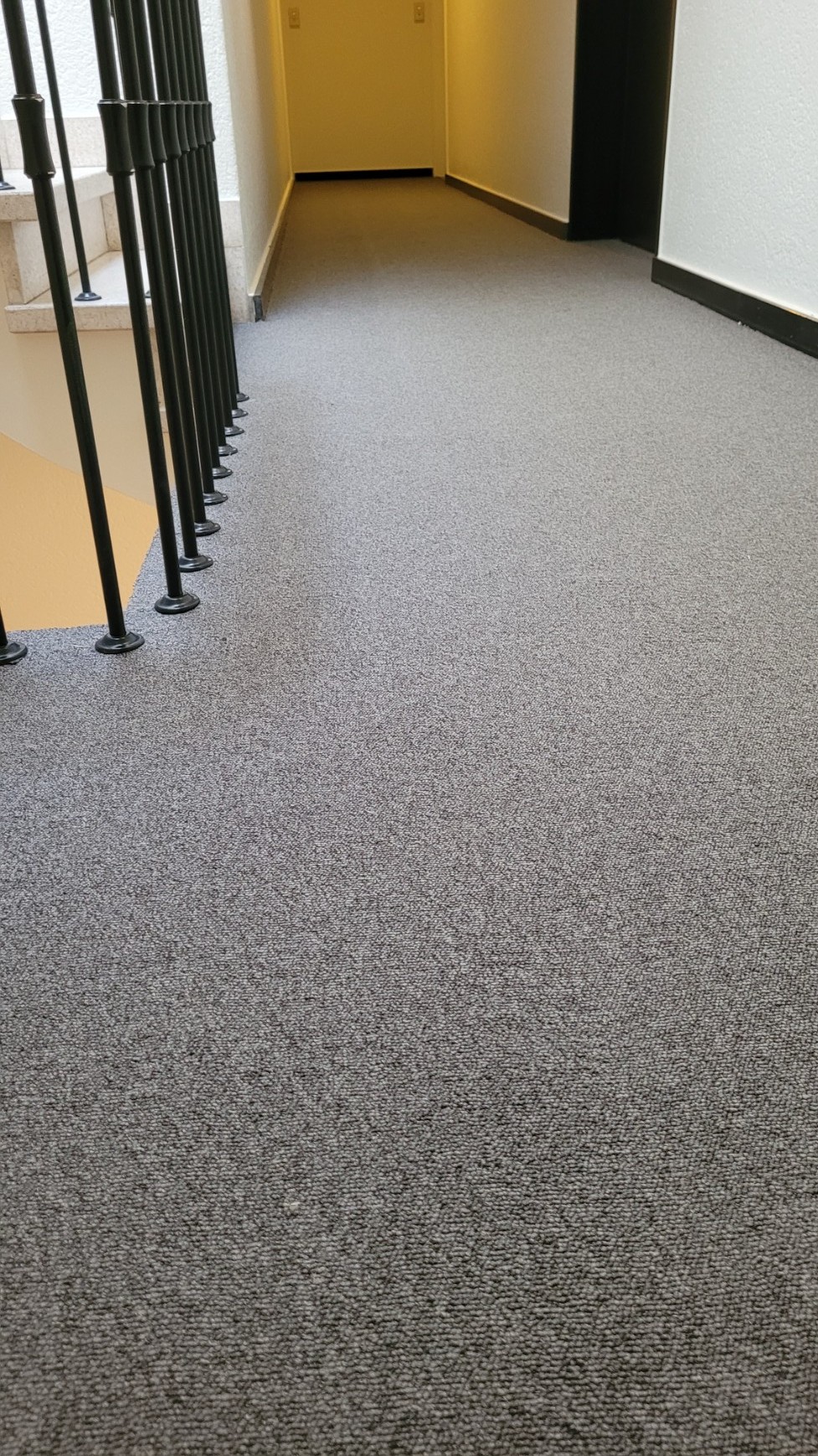 In de gang van dit gebouw werd gekozen voor een stijlvol vast tapijt dat niet alleen klasse uitstraalt, maar ook een praktische functie heeft. Dankzij de geluidsisolerende eigenschappen van het tapijt worden voetstappen en andere geluiden gedempt, wat bijdraagt aan een serene en rustige sfeer in het gebouw.