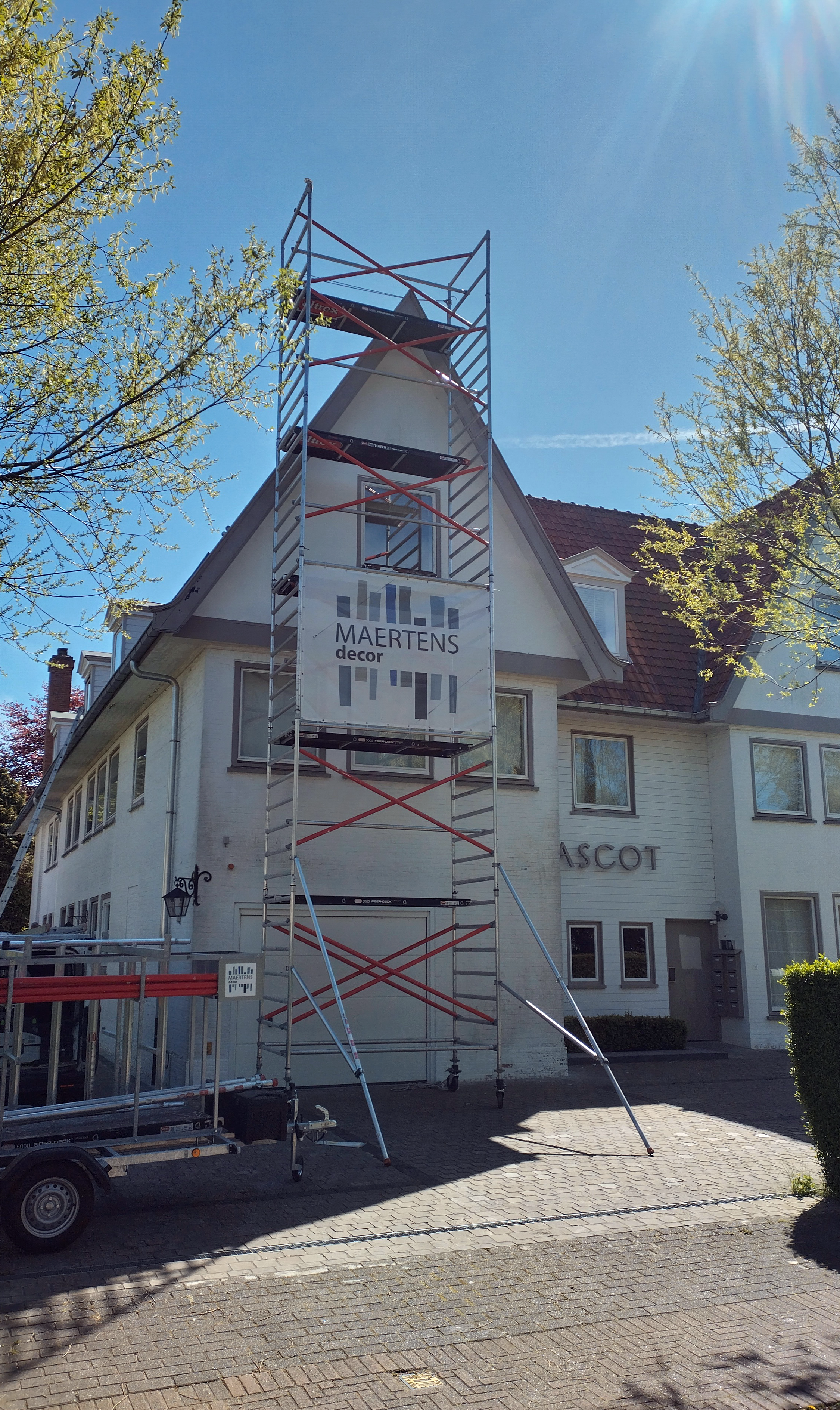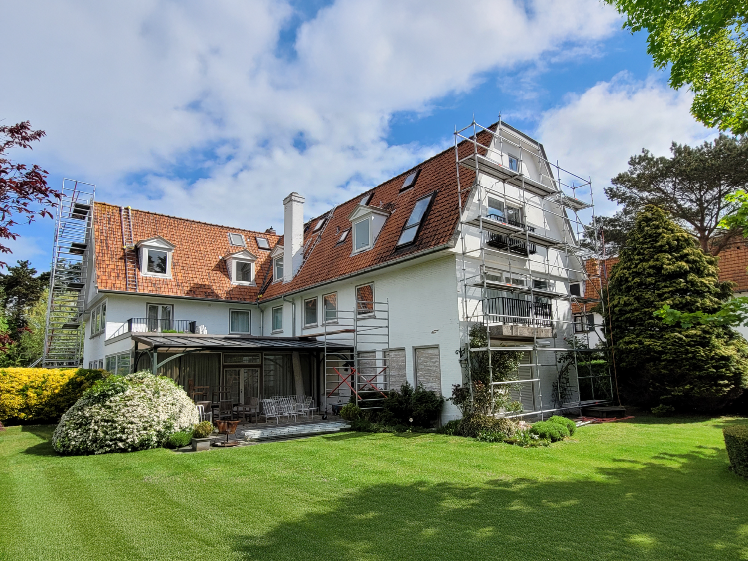 Deze trotse, klassieke residentie in het Zoute straalt opnieuw als nooit tevoren dankzij een grondige aanpak van Maertens Decor. Dankzij onze steigers en dakladders konden we elk moeilijk bereikbaar hoekje van de gevel behandelen en perfect afwerken.